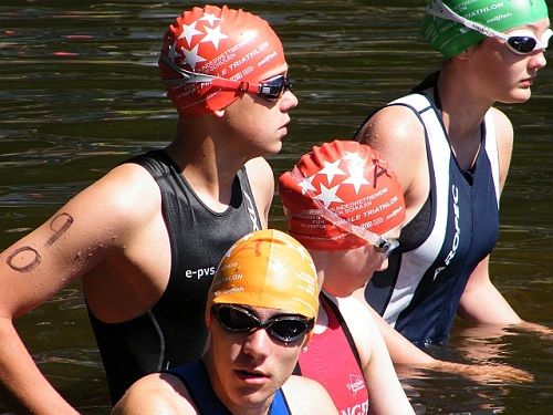 2 Jungen/ 1 Mädchen + 2 Mädchen /1 Junge – absolvierten jetzt die Hatz im A-B-C- System – immer in der Reihenfolge Schwimmen – Rad – Lauf. Vorsichtshalber hatten sich die Sportler ihre Reihenfolge auf den Handrücken geschrieben. Kommentar von außen: „...siehst du durch?...“; „...nee, aber die müssen's ja wissen!...“ Das völlige Durcheinander hat System! Schon nach dem 1. Durchgang waren die Leipziger vorn und bauten kontinuierlich die Führung aus. 2. war Klingenthal, 3. Riesa und knapp dahinter der Regionalsieger aus Dippoldiswalde/ Altenberg, die sich allerdings Einiges vorgenommen hatten.