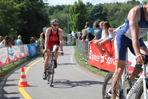 Der Wettkampf selbst ging bei mir dieses Mal in allen Disziplinen recht rund und kurzweilig über die Bühne. Der Motor scheint langsam zum Diesel transformiert. Schwimmen noch wie gewohnt solide schwach, alle Züge waren bereits abgefahren. Auf dem Rad hieß es nun, soweit wie möglich nach vorn zu kommen, was mir auch Dank Grahlo's ohrenbetäubender Anfeuerungsschreie während des Überholvorgangs gelang. Auf der letzten Radrunde fuhr ich auf einen unbekannten Berliner auf. Zusammen mit ihm ließ sich die Lücke zur Gruppe Koburger/Flachowsky beinahe noch schließen. Als Trio mit Flachy ging es auf Position 6 auf die Laufstrecke. Zwei Laufrunden um den Dreiweibener See standen nun noch auf dem Programm. Hinzu kam je eine kurze Wendepunkt-Abzweigstrecke, scherzhaft auch als Energy-Lab bezeichnet, auf der man Abstände, Tankfüllung, Kampfeswille und weitere wichtige Parameter der unmittelbaren Konkurrenten analysieren konnte. Der Berliner lief stark an, löste aber plötzlich den Parkschein und wurde nicht mehr gesehen. Flachy entfernte sich langstrecklertypisch, vermutlich mit auf die Sekunde konstanten Kilometersplits stetig schneller nach vorn, nach hinten schien Luft zu sein. Allerdings nicht ausreichend: Trotz eines Positionsgewinns eingangs Runde 2 kam 500m vor dem Ziel noch ein Athlet vorbei, den ich gar nicht auf dem Schrim hatte und zunächst für einen Staffelläufer hielt.