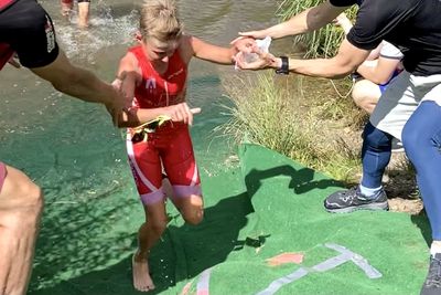Als erste von uns musste Marleen um 9:00 Uhr an den Start. Geschwommen wurde in der Saale, die zu diesem Zeitpunkt aber noch recht frisch war, weshalb der Neo angezogen werden konnte. Nach den 750 Meter, die mit der Strömung und gegen die Strömung geschwommen wurden, kam Marleen dicht gefolgt von Flavia (SC Chemnitz Triathlon) aus dem Wasser. Dann ging es auf die 20 Kilometer Rad-Strecke.