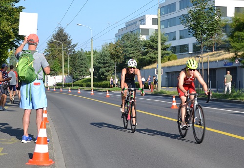 Die Radstrecke hatte es mit einer 12%igen Abfahrt und einem ähnlich steilen Anstieg echt in sich, aber bisher lag mir das Radfahren immer sehr gut. Am ersten Berg konnte ich schon auf die zwei führenden Mädels auffahren. Es machte echt Spaß die Berge zu erklimmen und die Abfahrten zu genießen. Dennoch war Vorsicht geboten, da es auch sehr anspruchsvolle Wenden oder 90°-Kurven gab. Zusätzlich war das Windschattenfahren freigegeben, auch über die Altersklassen hinweg. Deshalb fuhr sich in der ersten Runde relativ schnell eine Führungsgruppe über ca. 7 Athletinnen (mich inbegriffen) zusammen. In der zweiten (und letzten) Runde gelang es einer Schweizerin und mir, sich am Berg abzusetzen und eine kleine Lücke zu reißen. Dies beflügelte zusätzlich und zauberte mir ein Lächeln ins Gesicht.