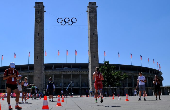Caro läuft auf das Olympiastadion zu.